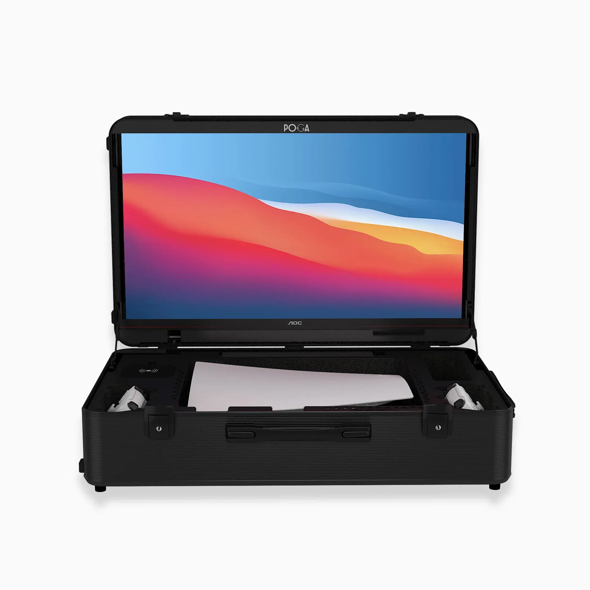 Esses kits são vendidos pela marca alemã POGA. Segundo o site oficial da marca, são duas opções de case. A POGA Lux, escolhida por Endrick, tem 58x39x18cm e pesa 9,9kg vazia. Dentro, a tela AOC 24G4XE de 23.8 polegadas Full HD com 180Hz de atualização, 1ms de resposta, HDR10 e FreeSync Premium. O hub POGA Connect oferece três USB-A 3.0 e um USB-C com 65W de carga rápida, suficiente pra carregar controles e celulares juntos. O cooling passivo, com slots ventilados e espuma separadora, segura o PS5 em 50-60°C por duas horas de multiplayer, . O trolley removível leva os 13kg carregados com facilidade, e o IP52 protege de poeira e pingos de chuva. O preço da maleta é a partir de 969.
